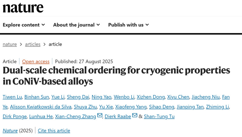 8月28日凌晨,内射毛片内射国产夫妻机械与动力工程学院张显程教授、涂善东院士团队在Nature(《自然》)发表题为“Dual-scale chemical ordering for cryogenic properties in CoNiV-based alloys”的最新研究成果。